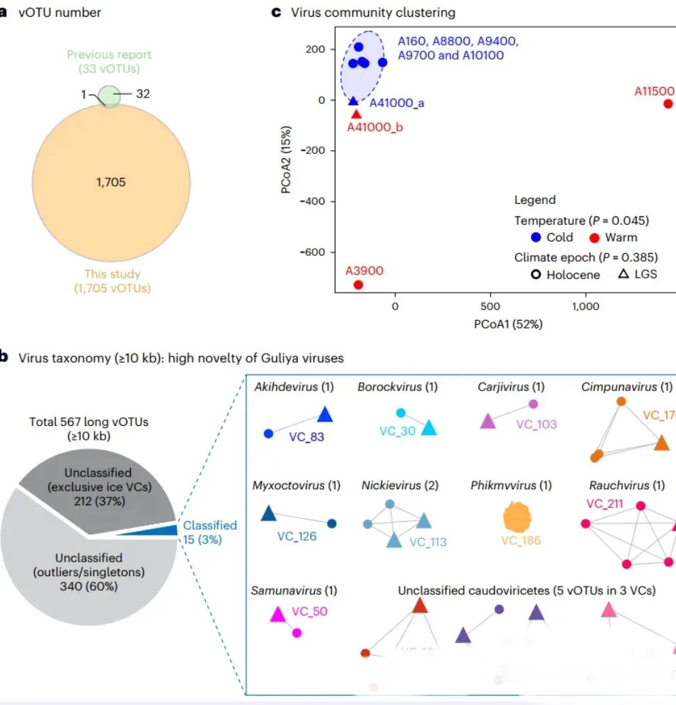 該研究的創(chuàng)新之處在于,它first詳細(xì)地重建了跨越多個(gè)冷暖周期的病毒基因組,并揭示了病毒群落在不同氣候條件下的變化模式。研究中恢復(fù)了1,705個(gè)接近物種級(jí)別的病毒操作分類單元(vOTUs),這一數(shù)量是之前報(bào)道的冰川保存的古老病毒(GPAVs)數(shù)量的五十多倍。
