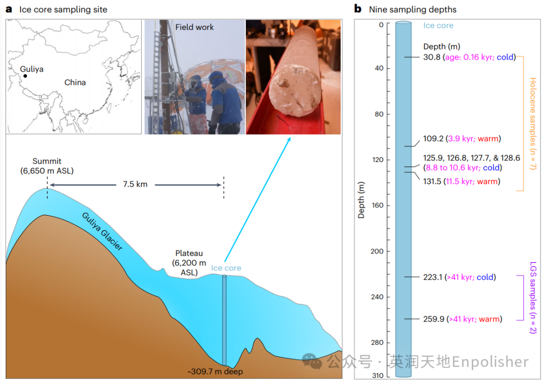 圖1. 冰川冰采樣。a. 在中國(guó)西部的古里亞冰川高原進(jìn)行了鉆探,海拔6200米。在冰川表面鉆探了一個(gè)309.7米長(zhǎng)的冰芯。為了比較,我們之前對(duì)病毒的研究來(lái)自在山頂(海拔6650米)鉆探的冰芯。b. 從冰芯中采樣了九個(gè)深度,跨越兩個(gè)主要?dú)夂驎r(shí)代:全新世和末次冰期(LGS)。黑色數(shù)字表示從冰芯表面開(kāi)始的深度,品紅色文本提供了相應(yīng)的重建年齡,藍(lán)色/紅色文本指示寒冷/溫暖的古氣候條件。